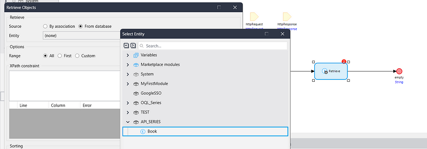 - Take a retrieve activity inside this microflow -> retrieve data from database -> select your Book entity.