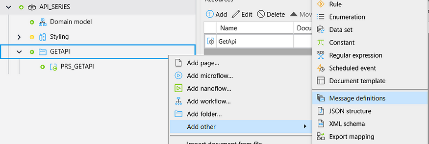 Go to MX Studio Pro create a folder GETAPI -> right click on it-> click on other->Published Rest Service & give the name PRS_GETAPI.