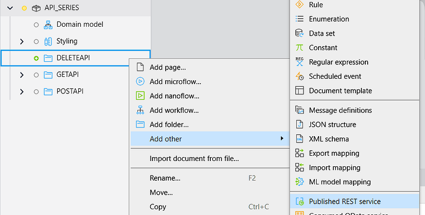 Go to MX Studio Pro create a folder DELETEAPI -> right click on it-> click on other->Published Rest Service & give the name PRS_DELETEAPI.