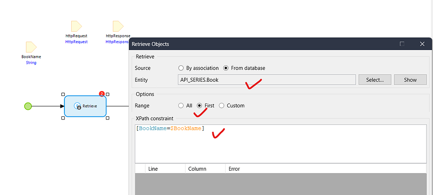 - Take a retrieve activity -> select yout Book entity -> in the range select First -> in the Xpath pass this [BookName=$BookName].