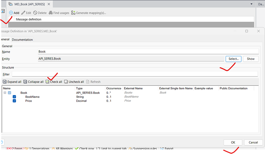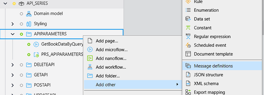 Go to APIPARAMETERS folder-> right click on it-> click on other->Message Definition & give the name MD_Book.