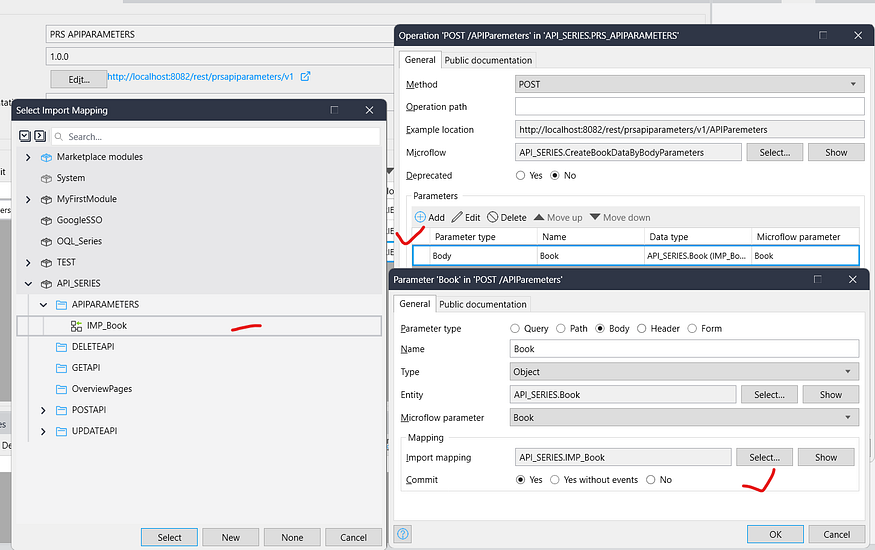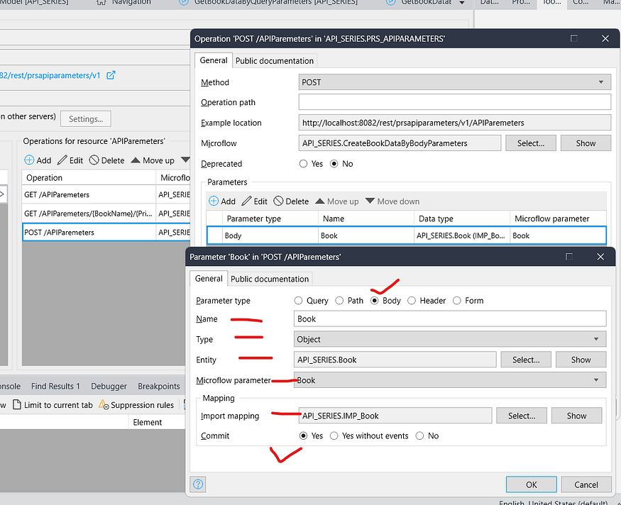 Now go to again PRS_APIPARAMETERS -> Open POST/APIParameters-> Add one body parameter(Book)-> Type(Object)->Entity(Book)->Microflow parameter(Book) and select your import mapping(IMP_Book).