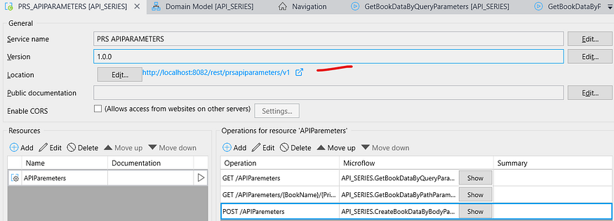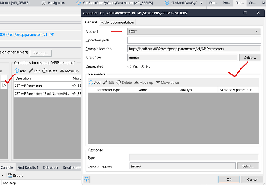 Go to PRS_APIPARAMETERS-> Add operations for ‘APIParameters’-> Select POST Method & in the microflow create a new microflow(CreateBookDataByBodyParameters).
