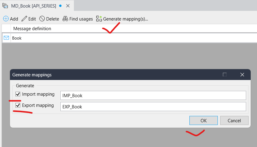 Navigate to MD_Book (Message Definition) -> Select Book -> Click on Generate Mapping and create both Import and Export mappings.