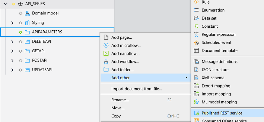 Go to MX Studio Pro create a folder APIPARAMETERS-> right click on it-> click on other->Published Rest Service & give the name PRS_APIPARAMETERS.