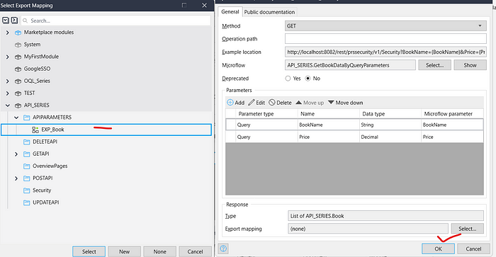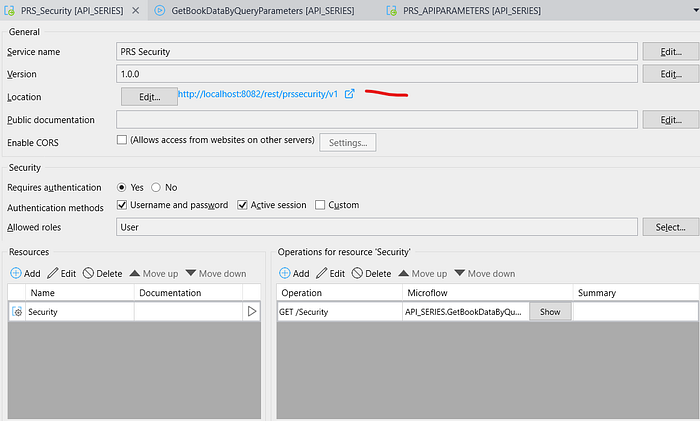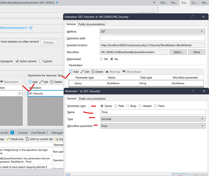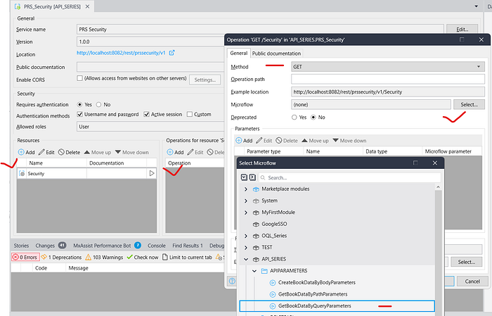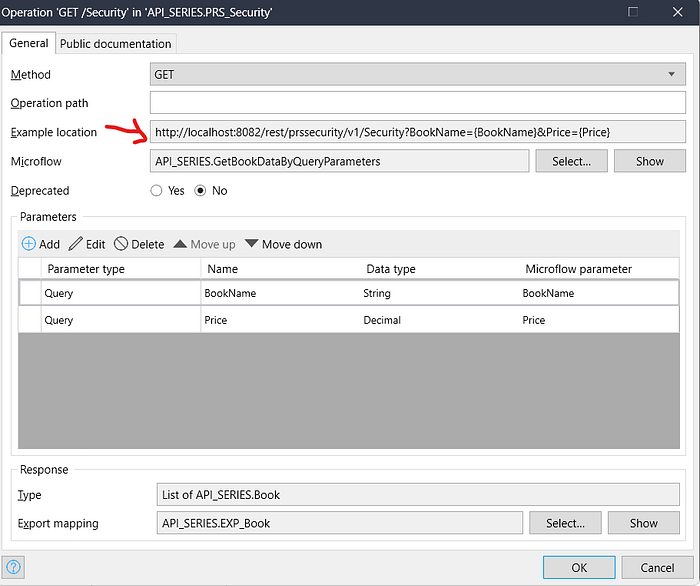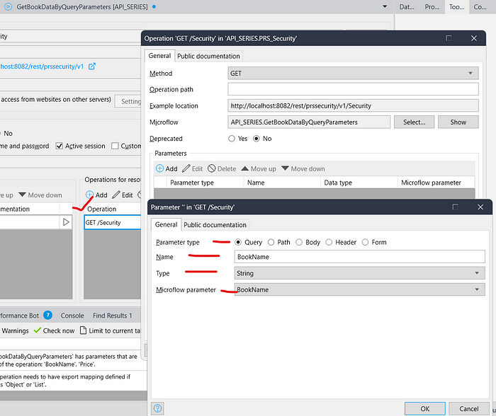 Add resource(Security) -> Add operation for Security resource -> Select GET Method & in the microflow select your GetBookDataByQueryParameters microflow from APIPARAMETERS.