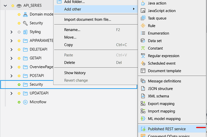 Create a folder Security -> right click -> Other -> Published Rest Service -> Give the name PRS_Security.