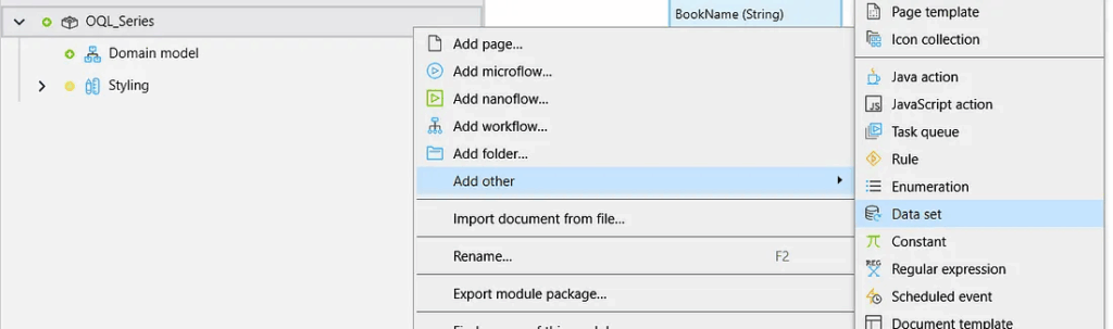 Right-click on MyFirstModule or YourModuleName(OQL_Series) -> Add Other -> Data Set -> Give any name(OQL_JSONExporter) & Click Ok.