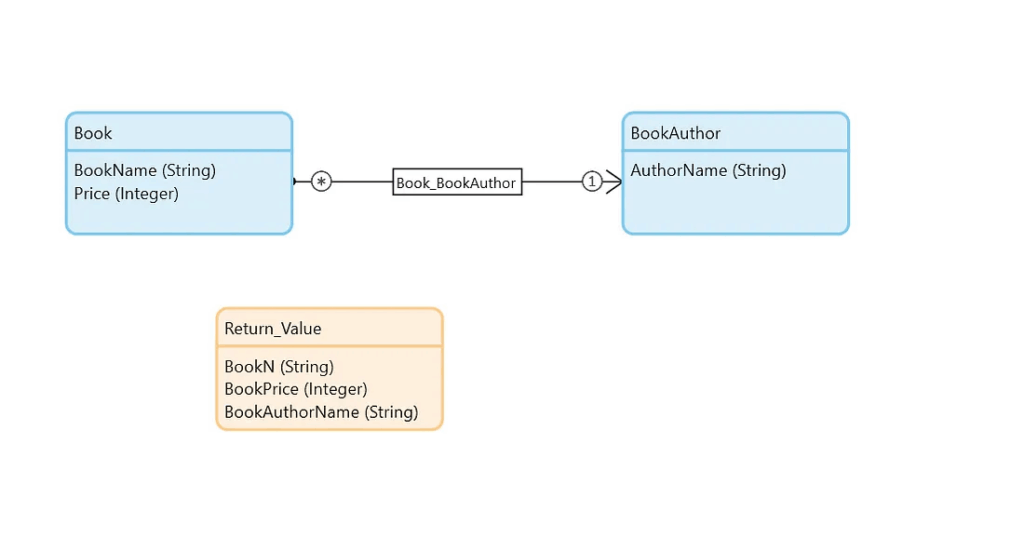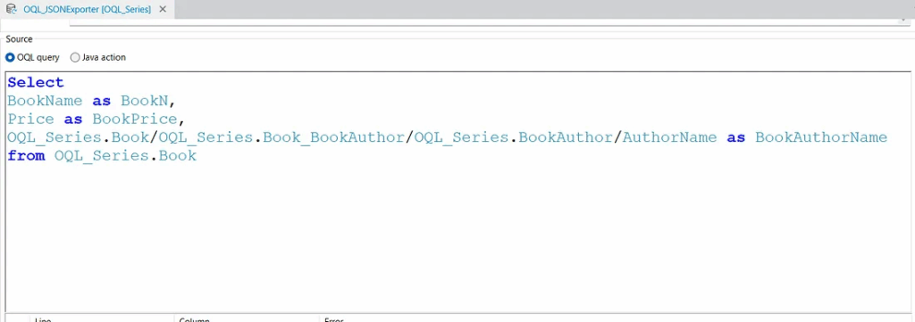 BookName, Price, and AuthorName are the attribute names of a persistable entity. Use these exact names as defined in the entity. The module name is OQL_Series, and you can select your entity by using a dot (.) notation.